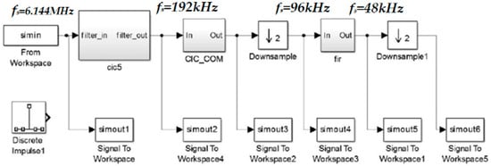 Decimation can be seen as extracting the data stream at equal intervals from the time domain and restoring the initial signal based on the extracted data. From the frequency domain, the signal is extended with smaller frequency intervals, but if the sampling rate does not meet the requirements of Nyquist’s theorem, the signal will be mixed. If the output data rate are much higher than the Nyquist frequency, it will increase the computational burden of the system accordingly. The modulator outputs a 1-bit data stream with a large amount of data. A decimation filter is applied to reduce the sampling frequency to the Nyquist frequency and convert the high-speed unit digital signal from the modulator into a low-speed multi-bit digital signal. Usually, the back end of the sigma-delta modulator employs decimation and low-pass filtering using the CIC filter (Cascaded Integral Comb Filter) cascade scheme. The cascaded behavioral model of the back-end digital decimation filter in sigma-delta ADC is shown in Figure 6 from Simulink.