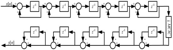 (1) First-stage CIC filter: The CIC filter designed in this work uses a “5-stage integrator-extractor-5-stage differential” topology, which is shown in Figure 7. This topology can modify the extraction factor MCIC to control the sampling frequency and passband cut-off frequency of the overall filter, and the structure can make full use of the integrator and differential of each stage.
