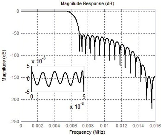 The entire digital decimation filter was designed using Verilog hardware description language in Modelsim, and simulation waveform results were provided. The simulation results of the sigma-delta ADC system under Simulink were used, and the output of the modulator was used as the input signal of the decimation filter. The digital filter did not have a deteriorating effect on the performance of the entire ADC system. Then, the digital decimation filter was implemented using Verilog code in Modelsim. The model was established under Simulink, and the amplitude-frequency characteristics of the digital filter system are shown in Figure 8. The signal bandwidth reached 36 kHz, and the stopband attenuation reached −71 dB. The results met the design requirements, and it can be concluded that the designed digital decimation filter achieved 128 times the downsampling function.