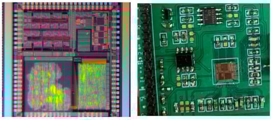 With optimization improvement of circuit simulation and layout design, this work was simulated and designed in Cadence and by a four-layer metal double polycrystalline process from Shanghai Hua Hong standard 0.35 μm CMOS. The chip photo and testing PCB are shown in Figure 9. The effective area of the chip is 9 mm2. In order to thoroughly test the performance of the sigma-delta ADC chip, the testing PCB needs to be designed to perform detailed static and dynamic performance tests on it. An Agilent E3631 (Agilent Technologies Inc., Santa Clara, CA, USA) powers the system with a supply voltage range of 5 V to 7 V. Reducing the supply voltage reduces the overall power consumption. However, a high supply voltage helps reduce the noise of the pre-stage conversion and improves the accuracy of the output. For testing dynamic characteristics such as harmonic distortion, we used a 5 V supply, corresponding to reference voltages of 2.5 V. The Tektronix AFG3102 (Tek Technology Co., Shanghai, China) function signal generator can provide the clock signal for the modulator. Agilent 35670 (Agilent Technologies Inc., Santa Clara, CA, USA) is used to generate analog sine signals. Agilent 16804A (Agilent Technologies Inc., Santa Clara, CA, USA) is used to capture the digital signal of the modulator, and then we use the Matlab program (R2016a, MathWorks, Natick, MA, USA) to analyze the PSD of the output signal.