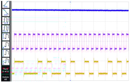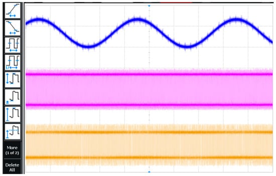 The transient simulation result of the modulator is shown in Figure 9 when the sampling frequency of the modulator is 6.144 MHz, the input sinusoidal signal frequency is 24 kHz, and the amplitude is −6 dBFs. The waveform in Figure 10 is the input signal, the clock signal, and the digital output signal in order. Figure 11 is the local amplification result of Figure 10. The brief graphical comparison shows that it can achieve the function of analog-to-digital conversion.