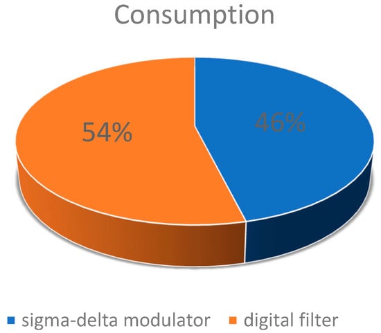 In our work, we use a power supply voltage of 5 V. The power consumption of the analog modulator is about 6 mW, and the power consumption of the digital filter is about 7 mW. The power consumption per block is shown in Figure 12. To validate the effectiveness of the chopper technique, we utilized a spectrum analyzer to test the circuit′s noise, and the noise results are shown in Figure 13. The 1/f noise corner frequency is reduced from 10 kHz to 0.7 Hz by the chopper technique.