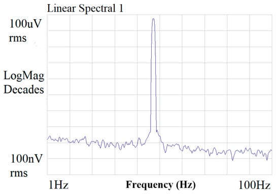 In order to further evaluate the performance accuracy of a sigma-delta ADC, it is necessary to analyze the spectral characteristics of the output digital signal and test the signal-to-noise ratio and harmonic distortion. When the input signal has an amplitude of 60 mV and a frequency of 200 Hz, the output spectrum is as shown in Figure 14. Figure 14 shows the output signal spectrum after 16-time quantization averaging. The maximum input signal amplitude of sigma-delta is −3 dBFs. The test results show that the noise floor is −135 dB (@1 Hz), the dynamic range is 118 dB, the bandwidth is 24 kHz, the maximum signal-to-noise ratio is 110.5 dB, and the practical bit number is 18.06 bits. We compared our work with other reported works to evaluate sigma-delta ADC performance, as shown in Table 5. Table 5 summarizes the basic test parameters of the sigma-delta ADC. Although the FOM (Figure of Merit FOM = P/BW × 10DR/20) of this work is smaller due to the disadvantage of the process, the comparison shows that this work achieves more excellent performance, and the circuit in this work consumes less power compared to the Ref. [], and the Refs. [,] achieve a lower power consumption, but its dynamic range is lower compared to this work.