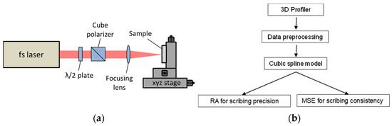 The laser scribing experimental setup, as depicted in Figure 1a, is outlined in the following bullet points.