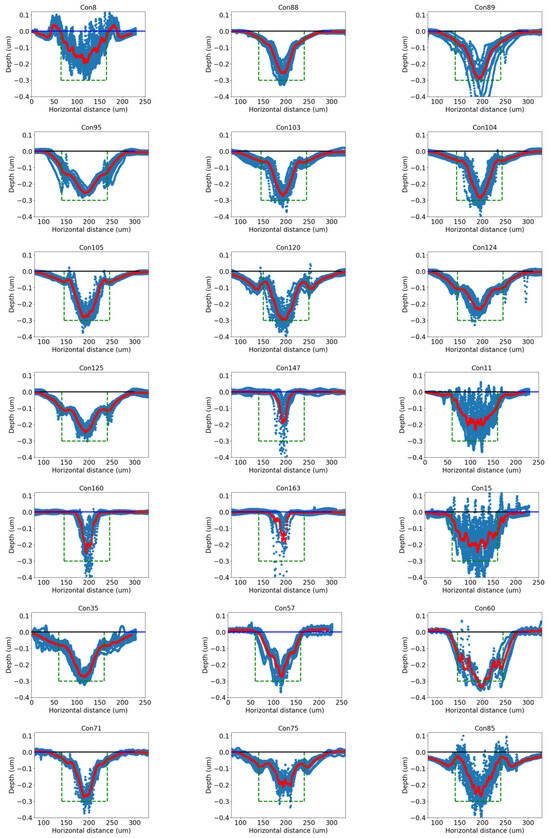 A selected 21 among 171 conditions in Figure 2 were chosen to filter out defective samples via the targeted scribing depth, which measured approximately 300 nm. Specifically, a scribing condition was chosen when the average scribing depth of all samples under this condition fell within a tolerance range (250–350 nm). Figure 2 shows 21 fitted cubic spline cross-section profiles in red. Specifically, 10 profiles were generated for each scribing condition. At each spatial location, 10 depths were averaged. The collection of all averaged depth data was then fed into the proposed cubic spline model to generate the red profiles in Figure 2. Each plot is under one scribing condition. Multiple scribing cross sections shown in blue profiles were used to fit a cubic spline model. These scribed conditions were chosen based on the average scribe depth.