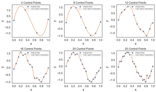 Cubic spline interpolation is a mathematical technique used to create smooth curves through a series of data points. It works by breaking a dataset into smaller segments and fitting cubic polynomial functions to each segment. This process results in a continuous curve that closely follows the original data, providing a high level of accuracy. As shown in Figure 3, control points are crucial in determining the accuracy of the interpolated curve. Starting with just four control points, the interpolation may exhibit slight variations from the original data. However, as we increase the number of control points to eight, twelve, sixteen, twenty, and finally twenty-five, the cubic spline interpolation becomes progressively refined. This refinement allows it to capture finer details with greater precision. This demonstration highlights how the choice of control points significantly influences the geometric shape of the interpolation, emphasizing the importance of careful parameter selection in achieving the desired outcomes.