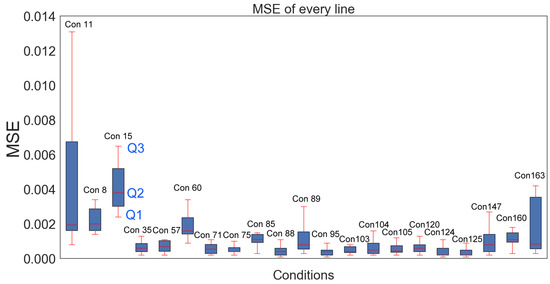 A small MSE value indicates a consistent scribe line and accurate reproduction of the scribe profile, while a large MSE suggests a significant deviation from the reference scribe line and indicates an issue with the scribing process. This information can help balance the choice of optimal operating settings. Figure 4 provides a comparison of the laser scribing in terms of MSE for selected scribing conditions. A boxplot displays the distribution of MSE values for each condition across 10 trials (i.e., 10 different scribes under the same conditions). A few scribing conditions, for example, conditions 11, 15, and 163 (depicted as Con 11, 15, and 163 in Figure 4), exhibited broad distributions of MSE values. This implies that their performances were not very consistent across 10 trials. Conversely, most scribing conditions had narrower MSE distributions, which suggests more consistent performances.
