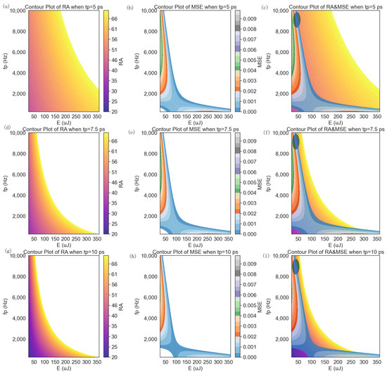The contour plots of RA, MSE, and superimposed RA and MSE: (a–c) tp = 5 ps, (d–f) tp = 7.5 ps, (g–i) tp = 10 ps (c,f,i are superimposed charts from their previous two charts).