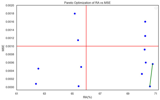 A scatter plot depicting (RA, MSE) values across 18 parameter settings (the green line is the Pareto front, the two (RA, MSE) pairs dominate all the other pairs). The blue dots represent the 18 distinct parameter settings (S1 through S18) shown in Table 6. The green line represents the Pareto front, where all compromised solutions are dominated by solutions on this front.