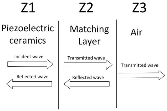 Air-coupled ultrasonic transducers facilitate electric energy conversion into ultrasonic waves through air as the transmission medium. These transducers are widely used in intricate fluid measurement environments because of their non-contact measurement, high precision, and easy maintenance. They usually comprise piezoelectric ceramics, a matching layer, and a backing layer. When sound waves are emitted from the piezoelectric ceramic and enter the medium, the significant difference in acoustic impedance [] causes most of the sound waves to reflect. To enhance transmittance and decrease the reflection of acoustic waves at the boundary, an acoustic matching layer is added between the piezoelectric ceramic and the air medium. Consequently, the ultrasonic transducers’ functionality depends significantly on the matching layer’s design.