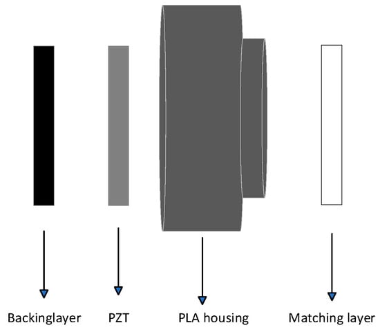 Figure 2 displays the precise assembly procedure for the ultrasonic transducer, which consists of the matching layer, PLA housing, PZT piezoceramic, and the backing layer. A detachable mold of the desired thickness, coated with a release agent, is fabricated through a 3D printer. Then, the filler-mixed substrate is poured into the mold and solidified at room temperature. After the curing process was completed, we utilized a motorized sanding tool to sand the matched layer samples and measured their thickness with a micrometer to achieve the desired level of smoothness and thickness for the flattened surface. We used a 3D-printed PLA shell to create the housing.