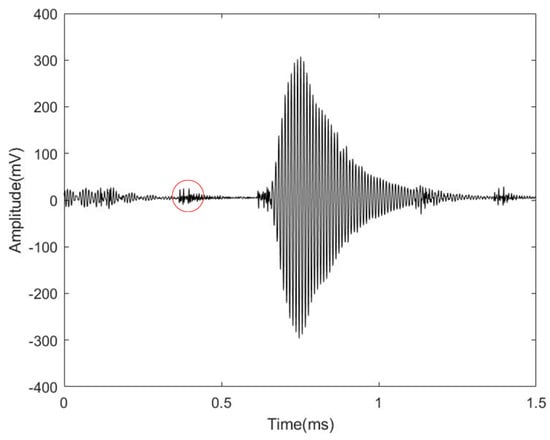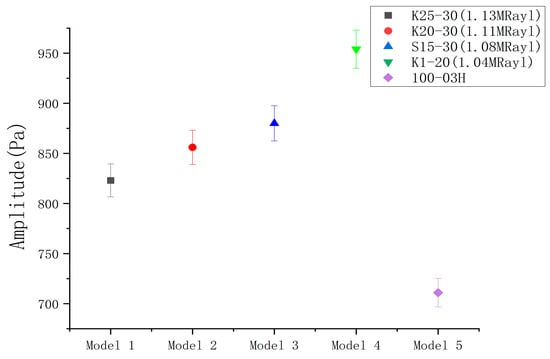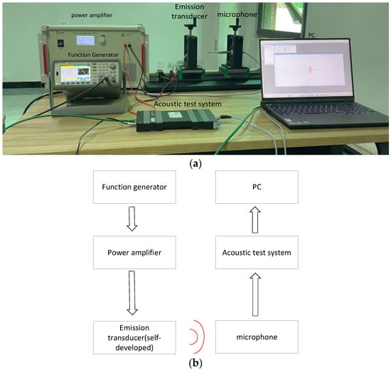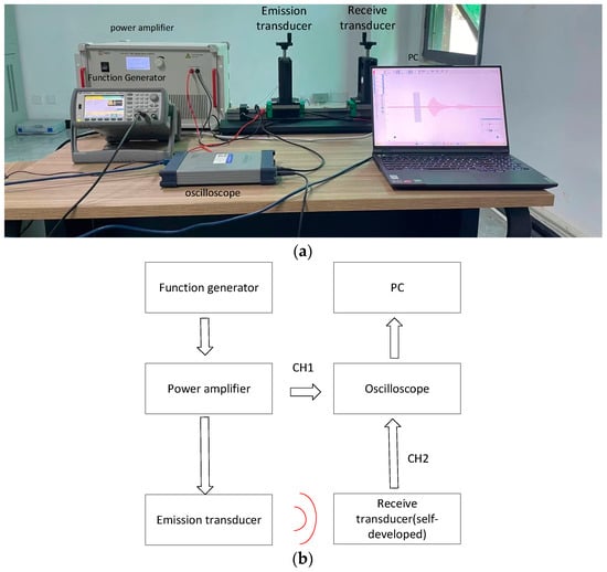 As shown in Figure 3, the pulse signal from the function generator gets amplified by a power amplifier, which drives the ultrasonic transducer to emit ultrasonic waves. At the receiving end, the ultrasonic waves are received by a microphone type 4138-C-006 (Hottinger Brüel & Kjær Inc., Copenhagen, Denmark), and the signals are transmitted to a LAN-XI acoustic test system (Hottinger Brüel & Kjær Inc., Copenhagen, Denmark) for signal processing and presentation of acoustic signals (sound pressure) using Labshop software (Version 23.0.0.834-2020-01-10) on a computer.