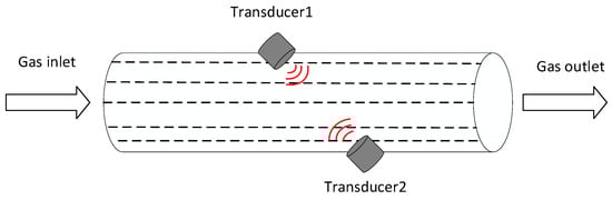 The time-difference ultrasonic flowmeter operates as shown in Figure 5 and calculates the fluid flow in the pipe by determining the difference between the downstream and upstream time, which is then multiplied by the pipe’s cross-sectional area to obtain the flow rate. Since the same type of homemade ultrasonic transducer is used for transmitting and receiving, the cis-countercurrent received waveforms show a very high correlation, and in this study, the velocity is obtained by calculating the time difference through the correlation [,,] (Mutual Correlation Algorithm).