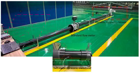 To confirm the practicality of the homemade ultrasonic transducer, it was installed in a differential time ultrasonic gas flowmeter [,] and tested using a Flowsick 600 series 8-channel ultrasonic flowmeter (Sick Inc., Waldkirch, Germany) as a standard reference flowmeter with a pipe diameter of 150 mm.
