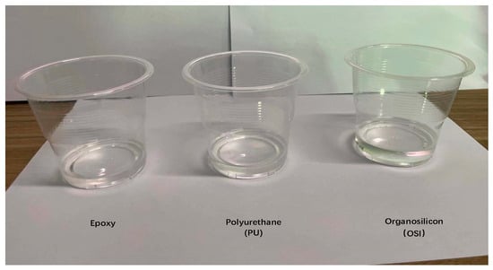 Figure 7 displays the results of the three substrates after being cured, indicating that all three are transparent. Table 4 exhibits the results of the substrate examinations. Epoxy resins are commonly utilized as a substrate for the matching layers of ultrasonic transducers due to their cost-effectiveness [], with a hardness up to Shore D70 or even higher. However, they have a higher acoustic impedance and acoustic attenuation. Compared to epoxy resin and polyurethane, organosilicon exhibits a lower acoustic attenuation coefficient and acoustic impedance, superior acoustic wave transmission performance, a Shore A70 hardness, and certain mechanical strength. These findings indicate that silicone substrates hold great potential for use in the production of the matching layers for ultrasonic applications.