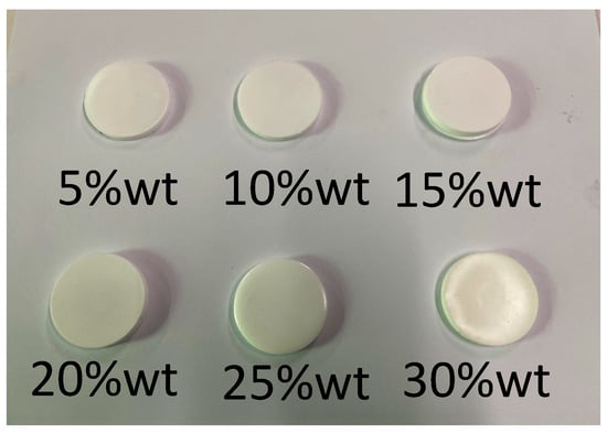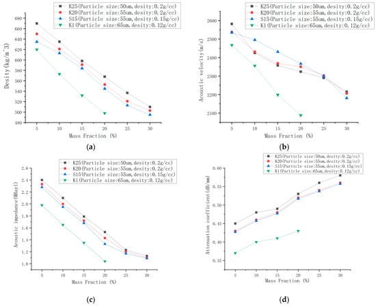 Figure 8 displays the matching layer samples with six different mass fractions, where the addition of hollow glass microsphere filler caused the substrate to change from a transparent color to pure white. The acoustic test results of four different hollow glass microspheres at mass fractions of 5%, 15%, 20%, 25%, and 30%, respectively, are shown in Figure 9. The K1 hollow glass microspheres were challenging to mix and were therefore not reported in this study for mass fractions exceeding 20%. From Figure 9a, it is evident that the density decreases with the increase of mass fraction. Additionally, comparing the K25 and K20 curves suggests that larger particle sizes have a more significant effect on reducing density. Similarly, comparing the K20 and S15 curves shows that fillers with lower density result in a more significant reduction in density. From Figure 9b, the graph of the sonic velocity in the solid sample shows that as the mass fraction increases, the sonic velocity decreases. However, within the 15–20% interval, there is a tendency for the slope to slow down. This can be attributed to the saturation of particle distribution within the filler of the solid. Figure 9c shows results from the sample’s acoustic impedance test, indicating a gradual decrease in acoustic impedance as the quality fraction increases, with the acoustic impedance reaching approximately 1 MRayl at the filling limit. Figure 9d displays the test results for the acoustic attenuation coefficient of the samples. It is evident that the attenuation coefficient increases with the increase in mass fraction. Additionally, upon comparison of different types of hollow glass microspheres, it can be observed that smaller particle sizes result in more significant scattering phenomena, leading to even more significant attenuation coefficients.