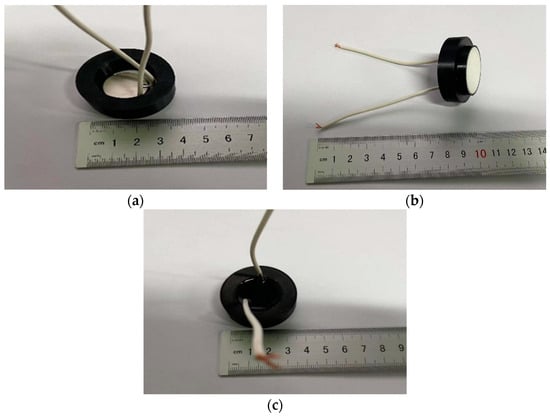 PZT ceramics are available in various models with different compositional formulations, each with unique applications depending on their specific performance parameters. This study focuses specifically on the longitudinal telescopic vibration mode, the parameters of which are detailed in Table 1. PZT4 and PZT8 are characterized by their large longitudinal piezoelectric strain constant , but relatively small longitudinal piezoelectric voltage constant . As such, they are primarily utilized as emissive piezoelectric elements. The PZT5 series is commonly utilized as transceiver-integrated piezoelectric components due to its favorable longitudinal piezoelectric voltage constant , making it suitable for this study. The piezoelectric ceramics utilized in this investigation were purchased from Baoding Hongsheng Acoustic Devices (Hongsheng Inc., Baoding, China) and measured ∅20*4 mm.