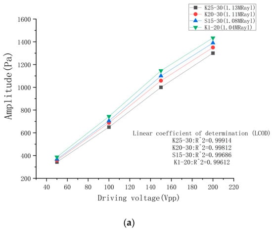 Figure 13 illustrates the test results of the four ultrasonic transducer models with four distinct excitation voltages. As shown in Figure 13a, the emission sound pressure of the ultrasonic transducer rises proportionally with the excitation voltage and displays a linear growth pattern, as indicated by the linear determination coefficient. K1-20 exhibits a better optimization effect compared to the other three ultrasonic transducer models. Figure 13b illustrates the electro–acoustic conversion efficiency results, demonstrating that at an excitation voltage of 50 Vpp, the electro–acoustic conversion efficiency is at its peak, but the resulting acoustic pressure amplitude is comparatively smaller. Meanwhile, at an excitation voltage of 150 Vpp, the electro–acoustic conversion efficiency remains high, and the sound pressure amplitude is adequate for more application scenarios. Thus, K1-20 boasts a higher conversion efficiency and sound pressure amplitude.
