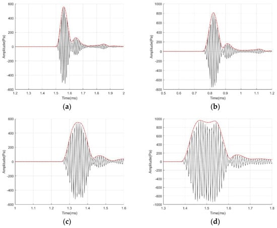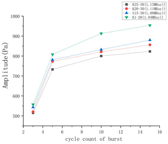 Figure 14 displays four ultrasonic transducer models subjected to different burst excitation cycles. The plot indicates a direct relationship between the sound pressure amplitude and the count of cycles. However, the increase in amplitude from 10 to 15 pulses is minimal. Figure 15 displays the waveforms of the K20-20 model subjected to four diverse burst period excitation conditions. It is evident that an increase in the number of pulses results in a wider width of the waveform of the emitted sound pressure, rendering the peak unclear. A significant and smooth peak would result in a smoother envelope and allow the accuracy of the peak-finding operation in subsequent algorithmic applications. When the number of pulses reaches 10, the amplitude of the waveform increases, the peak value becomes more prominent, and the envelope curve appears smoother.