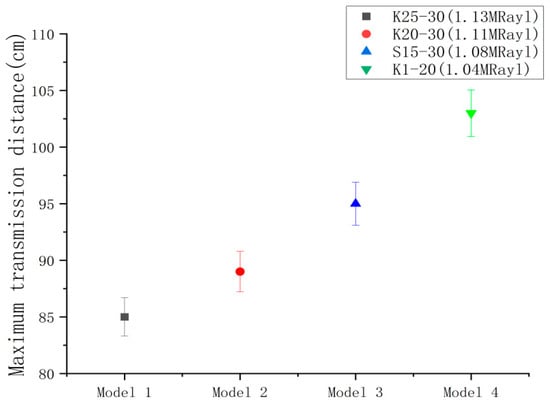 Based on the findings from the preceding sections, utilizing 150 Vpp and 10 cycles of burst as the optimal excitation conditions, the four models of ultrasonic transducers were stimulated to test the farthest transmission distance. The results, as shown in Figure 16, indicate that the ultrasonic transducer model K1-20 exhibits a longer transmission distance of 103 cm. As the transmission distance of the other models decreases, the reason for analyzing the cause is that there is a positive correlation between the farthest transmission distance and the acoustic pressure emission. Bigger acoustic pressure emission leads to a greater transmission distance.