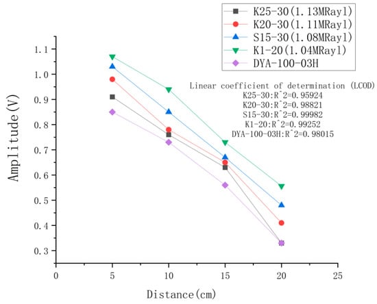 Figure 18 illustrates the received amplitude of a homemade ultrasonic transducer and a commercially available transducer at different distances. As the distance increases, the received amplitude of the ultrasonic transducer decreases almost linearly, as indicated by the linear coefficient of determination, and this attenuation is caused by the attenuation characteristics of air. According to the figure, the four homemade ultrasonic transducers outperform the commercially available ones in terms of receiving performance. Among them, the K1-20 model shows the highest receiving performance, which is improved by 26% compared to that of the commercially available transducers.