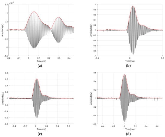 Received waveforms at different distances for model K1-20: (a) 5 cm; (b) 10 cm; (c) 15 cm; (d) 20 cm.