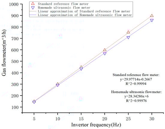 Figure 20 shows that when there is flow in the pipe, due to wind interference, the waveform at the receiving end will have some small burrs, but it can be seen that the amplitude of the small burrs for the actual received waveform is small, almost negligible, does not affect the judgment of the algorithm, this is all due to the gain in sensitivity. Figure 21 shows test results obtained through flow detection employing a homemade ultrasonic transducer. The flow rate elevates as the frequency of the frequency converter fan increases. The entire measurement area exhibits linear response characteristics. The decision coefficients of the standard reference flowmeter closely match those of the homemade ultrasonic flowmeter, with values of 0.99994 and 0.99976, respectively. Compared with the standard control flowmeter, the homemade ultrasonic flowmeter demonstrates an accuracy of 97.4% at flow rates under 600 , and 95.8% at rates higher than 600 . Verification through practical application reveals that the developed organosilicon hollow glass microsphere composite matching layer exhibits excellent air-coupling performance and holds promising prospects for future development.