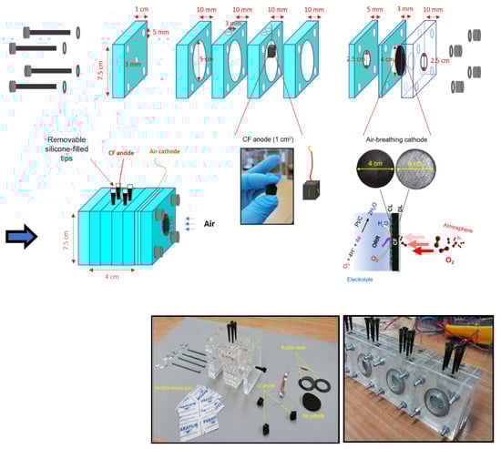 Schematic illustration of the components used for MFC biosensor construction and photos of pieces used in the final MFC biosensor assembly (left) and final forms of air-cathode, single-chamber MFC biosensors equipped with CF anodes and air cathodes after assembling (right).