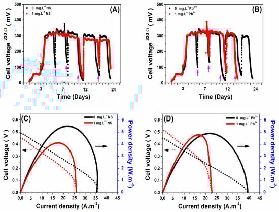 To assess the effects of specific pollutants on biofilm growth and electrochemical performance, the MFCs were subjected to two conditions: a control without pollutants and an experimental condition with a pollutant concentration of 1 mg L−1 (either NS antibiotic or Pb2+ ions). Figure 3A,B present the output voltages recorded over a 22-day operational span. These voltages provide a metric for evaluating the growth kinetics and maturation of anodic biofilms on CF anodes under both conditions. From the voltage–time profiles, it is evident that, after an initial seven-day period, all the MFCs achieved a stable output voltage, oscillating between 300 and 350 mV. This stabilization suggests the attainment of biofilm maturity, a finding consistent with previous observations from conventional air-cathode, single-chamber, bottle-type MFCs. The uniformity in voltage outputs across MFCs indicates that the introduction of pollutants, whether NS or Pb2+ ions, did not markedly alter the growth dynamics of the biofilms on the anodic surfaces.