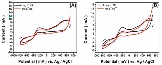 Cyclic voltammetry at 10 mV s−1 of MFC anodic biofilm reached maturity after 11 days of MFC operation without and with 1 mg L−1 of (A) NS antibiotic and (B) Pb2+ ions. Scan rate 10 mV s−1.