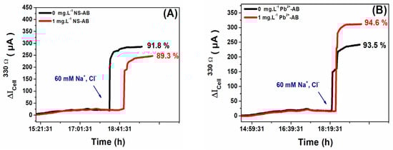 Effect of 60 mM (Na+, Cl−), σ ≈ 7 mS cm−2, on output currents of biofilm-based MFCs non-adapted and adapted to different toxicity concentrations: (A) NS antibiotic and (B) Pb2+ ions. These experiments were performed after the maturation/adaptation process of biofilms in a fresh medium with 10 mM NaAc substrate. The anode and cathode were connected across a 330 Ω external resistor.