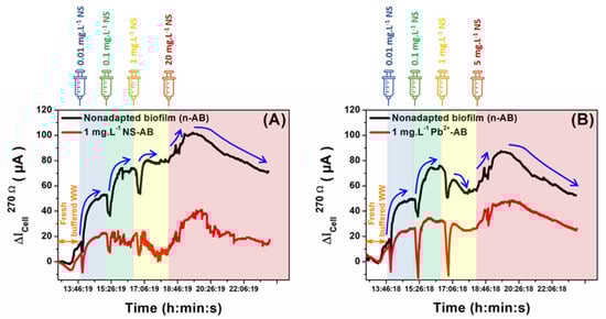 Change in output currents of mature electroactive biofilm-based MFCs non-adapted (black line) and adapted (red line) to 1 mg L−1 of NS or Pb2+ ions in fresh buffered wastewater with only 60 mM (Na+, Cl−), σ 7 mS cm−2, and 10 mM NaAc. Biofilms were challenged with successive additions of (A) NS in the concentration range 0.01–20 mg L−1 and (B) Pb2+ in the concentration range 0.01–5 mg L−1.