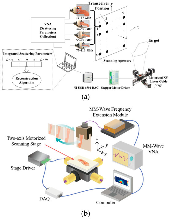 (a) The synthetic ultra-wideband millimeter-wave imaging (MMWI) approach. (b) The MMWI system for skin cancer imaging, realizing an overall synthetic bandwidth of 98 GHz. At each scanning step, four sub-band antennas are successively placed in front of the target to transmit their signals in their respective sub-bands and record the backscattered signals. The scanning process is automatically performed using a motorized stage in conjunction with two drivers, a computer with LabVIEW, and a data acquisition (DAQ) device, which generates the digital control signals from the computer [9,10].