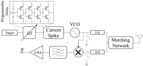 In this work, a pulse-radiating approach was adopted, as it provides a wider relative bandwidth and higher image resolution compared to continuous-wave radiators [16]. A delay generator was used to regulate the signal’s timing according to the supply voltage. As demonstrated in Figure 3, the trigger undergoes processing in a delay generator, consisting of a sequence of inverter stages that manage the signal’s timing in accordance with the supply voltage. In transmit mode, the pulse produced via the pulse generator is delayed and transmitted through an antenna. During reception mode, the front-end captures the backscattered reflection and combines it with a delayed version of the signal.