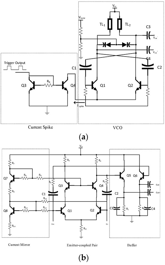 The schematic of (a) the pulse generator in this work, consisting of a current spike and a pulse VCO with asymmetric cross-coupled topology; (b) the LNA in this work, consisting of an emitter-coupled pair followed by two emitter follower stages as buffers; and (c) the wideband correlator with a multiplier, a low-pass filter, and a differential buffer.