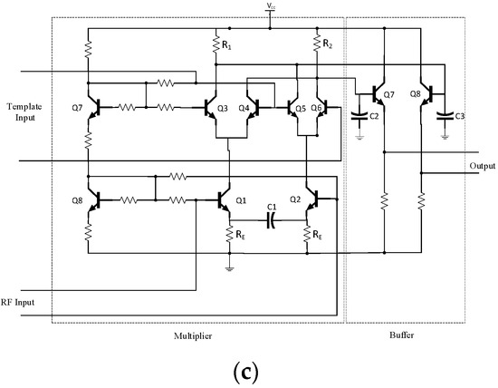 Figure 4c displays the diagram of the wideband correlator. The mixer’s core features a cross-coupled Gilbert cell configuration, incorporating two parallel stages in differential mode. This configuration is accompanied by a differential buffer. Biasing for the Gilbert cell mixer was achieved through a loaded current mirror. The employment of C1, along with RE in the emitter, creates a capacitive resistive shunt load, which compensates for gain drop at higher frequencies. This compensation ensures a group delay and gain uniformity across the desired frequency range. The low-pass filters were constituted by the Gilbert cell’s load resistors (R1 and R2) in conjunction with the buffers’ shunt capacitors (C2 and C3). These filters served to identify the envelope of the mixed signals. The maximum average power consumption of the sub-band correlators was 30 mW.