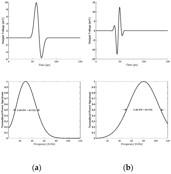 Figure 5 (top) shows the simulated pulses generated via the two sub-band pulse generators. The normalized power spectrums are demonstrated in the bottom row of Figure 5. The simulated center frequencies were close to the desired values (25 GHz and 80 GHz) and the 3 dB bandwidths were approximately 40 GHz and 60 GHz.