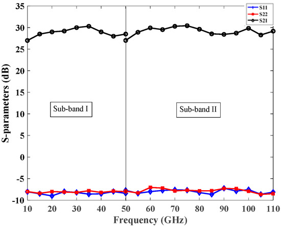 The simulated performance of the sub-band LNAs is demonstrated in Figure 6. In the front-end of the transceiver, the output of the switch was connected to the matching network input of the LNA (Figure 3). Consequently, the design of the LNA-matching network was tailored to the output of the switch instead of for a resistance of 50 Ω. The simulated return loss (referred to 50 Ω) was higher than 10 dB. This was due to the different impedance that the input of the LNA experiences in the detached scenario in contrast to the situation with the switch in place.