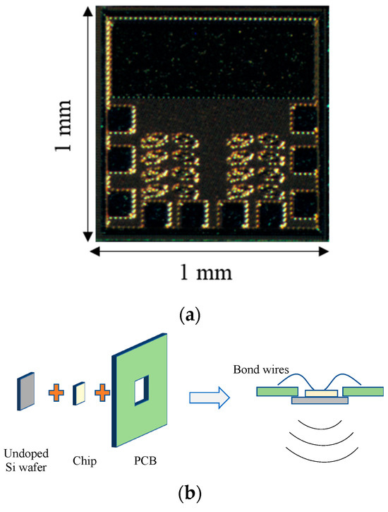 The imaging chip was fabricated in a 130 nm BiCMOS (8XP) technology process, with a cutoff frequency (fT) of 200 GHz and a maximum oscillation frequency (fmax) of 265 GHz. The fabricated chip micrograph is shown in Figure 8a. It covers an area of 1 mm × 1 mm. It was affixed to the backside of a Roger PCB, featuring a hole to allow radiation through the air. Wire bonding was employed to establish connections between the PCB and chip pads, as shown in Figure 8b.