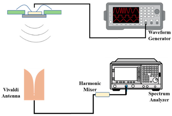 The imager chip is characterized in the frequency domain, as demonstrated in Figure 9. A pulse generator was used to create the trigger signal. A substrate integrated waveguide (SIW)-based Vivaldi antenna, which we had previously developed [8], was used as a receiving antenna. A harmonic mixer was used to down-convert the high frequencies of the received signal into low-frequency components at which the spectrum analyzer operates. Due to the limited frequency range of the harmonic mixer (75 GHz–110 GHz), the frequency domain characterization was only performed for the second sub-band (50 GHz–110 GHz).