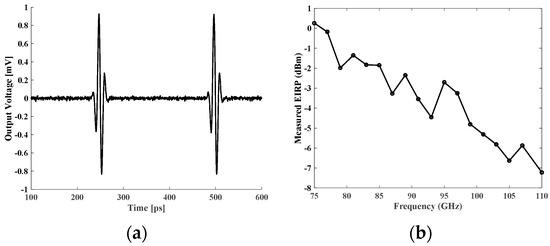(a) Measured pulse waveform for the second sub-band with a 13 ps FWHM pulse width. (b) Measured EIRP spectrum for the second sub-band (50–110 GHz).
