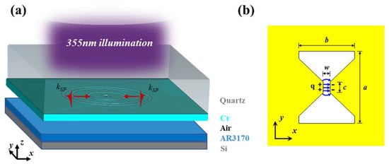 - Srisungsitthisunti, P.; Ersoy, O.K.; Xu, X. Improving near-field confinement of a bowtie aperture using surface plasmon polaritons. Appl. Phys. Lett. 2011, 98, 223106. [Google Scholar] [CrossRef]