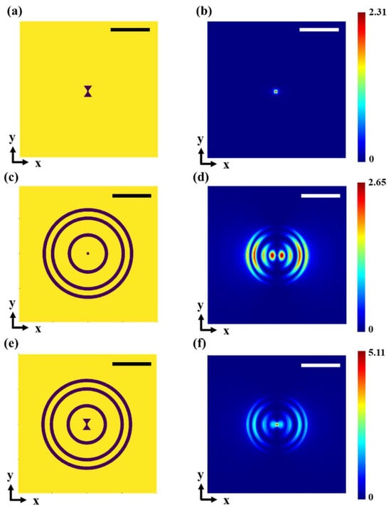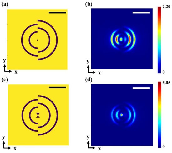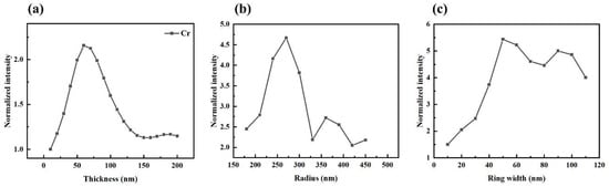 It is noteworthy that the bowtie configuration surpasses the circular counterpart in terms of both focal-spot dimensions and central electric-field intensity. The parameters of the bowtie aperture, including the metal-film thickness, radius of the ring grating, and width of the grating slits, have all been meticulously optimized. The outcomes of the parameter scan are illustrated in Figure 4.