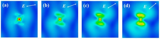 The electromagnetic-field distribution of the lens with various angularly polarized light incidences; (a) 10°, (b) 20°, (c) 30°, and (d) 40°.