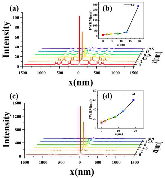 (a) Intensity of SP at different z underneath the Cr metal film and (b) the full width at half maximum of the focal spot; (c) intensity of SP at different z underneath the Al metal film; and (d) the full width at half maximum of the focal spot.