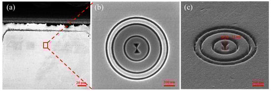 Upon the surface of a quartz substrate, a 60 nm thick chromium metal film was deposited using electron-beam evaporation (anelva L-400EK, Kawasaki, Japan). The designed plasmonic lenses (PL) were then fabricated using Zeiss triple-beam focused-ion-beam (FIB, zeiss orion nanofab, Jena, Germany) microscope. Considering both etching efficiency and structural accuracy, the circle grating was processed using a high-energy Ga-FIB with an accuracy of 20 nm, while the 20 nm bowtie structure, demanding higher precision, was processed using He-FIB. The smallest gap size that can be realized in this work is 21 nm, as shown in Figure 7.