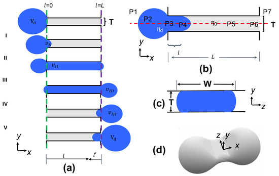 We assume that the width of the droplet inside the slit is constant, the same as the initial diameter of the droplet, given by . The flow rate Q due to pressure differential ∆Pηi and viscosity η inside the slit is represented by: