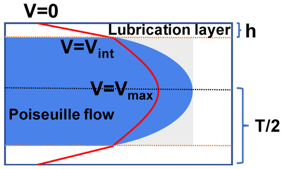 Let be the velocity of the droplet at the droplet–lubrication layer interface and be the maximum velocity of the droplet. The shear stress is continuous across the interface, so that: