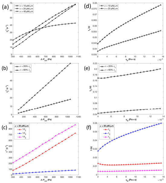 Effects of pressure drop and droplet viscosity ηd on transit times with finite values of surface tension σ. (a) Effect of with constant values of σ on the inverse of the total transit time 1/tT. (b) Effect of with σ as a fixed percentage of the critical surface tension value σc on 1/tT. (c) Effect of on inverse transit times of stages II to IV, 1/ti, for σ = 25 pN/µm. (d) Effect of ηd with constant σ values on transit time tT. (e) Effect of ηd with σ as fixed percentage of σc. (f) Effect of ηd on transit times of stages II to IV, ti, for σ = 25 pN/µm.