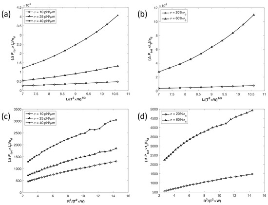 In Figure 4b, we see the effect of L/(T2 × W)1/3 on (tT)/ηd with surface tensions set at 20% and 60% σc. Similar to conditions at constant σ, there is an approximately linear relationship, with (tT)/ηd increasing at a higher rate when the surface tension is at a higher percentage of σc.